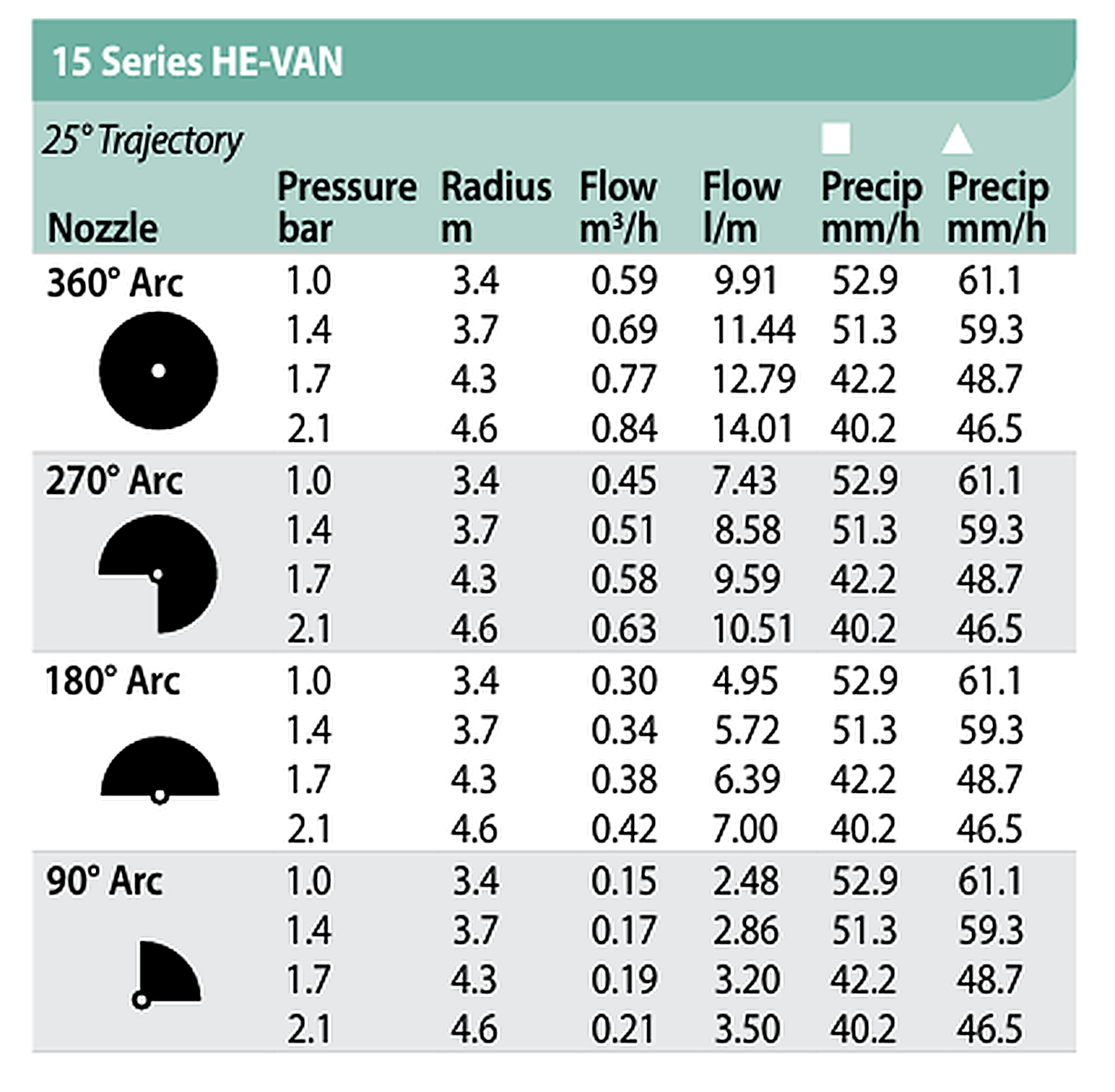 Rain Bird 15 HE-VAN este o duză de înaltă eficiență cu unghi reglabil, concepută pentru a oferi o uniformitate superioară a udării. Tehnologia HE-VAN (High-Efficiency Variable Arc Nozzle) permite obținerea unor margini de udare precise și picături de apă mai mari, rezistente la vânt, asigurând un gazon verde și sănătos cu un consum redus de apă.
